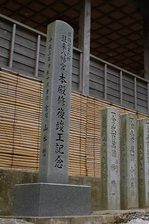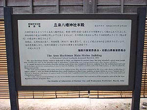 旦来八幡神社本殿、指定文化財の説明パネル。